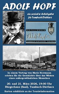 Dem Vortrag gehen 8 Jahre Recherche voraus die einem Puzzlespiel glichen. Die Aufklärung des Themas „Adolf Hopf“ interessiert immer noch zahlreiche Menschen, welche oft an mich heran traten und mich darum baten Nachforschungen anzustellen, um die wahre Geschichte zu rekonstruieren und endlich Gerechtigkeit in jene Angelegenheit zurückzubringen. Daraus ist ein unterhaltsamer, reich bebilderter und spannender Vortrag entstanden über ein Thema, welches noch nie öffentlich behandelt wurde: „Adolf Hopf, ein sozialer Arbeitgeber für Tambach-Dietharz“