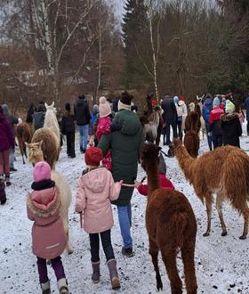 Freitag ging es mit den Lamas und Alpakas rund ums Wildgehege und Bromacker. Trotz der Kälte hatten schon viele der begeisterten Kinder und Erwachsenen bereits nach wenigen hundert Metern rote Wangen, verrutschte Mützen und strahlende Gesichter. Natürlich wurde von den Tieren nach Grashälmchen gesucht und verursachte so manchen „Stau“, da dauert es halt bis die Gruppe wieder zusammen war. Aber nach ca. 2 Stunden durfte David Kraft wieder all seine Tiere in Obhut nehmen. Auch das war ein gelungener Tag!