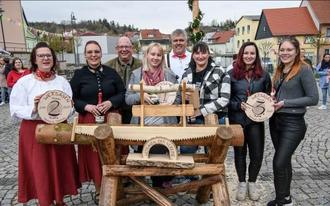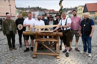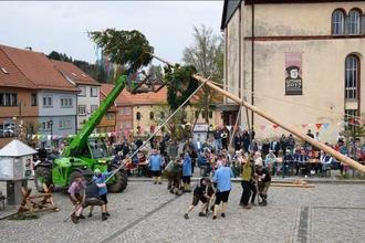 Pünktlich 14.00 Uhr traf der Maibaum auf dem Marktplatz ein und wurde in Position für das anschließende Aufstellen gebracht.