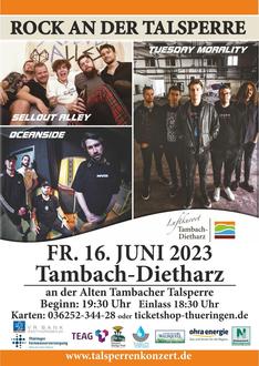 ... und los geht es am 16. Juni 2023 um 19.30 Uhr mit einem Rock-Konzert für junge und junggebliebene Leute mit 3 absolut angesagten Bands! Tuesday Morality, Oceansides aus Karlsruhe und Sellout Alley aus Erfurt.