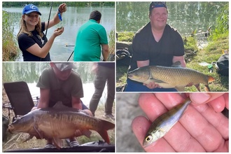 Die Ruten waren kaum ausgelegt, da kam auch schon die erste Fangmeldung „Graskarpfen“ von unserem Jonathan Queck. Der Fisch ging mit stolzen 100 cm Länge und 12,67 kg gleich ganz oben in die Wertungsliste ein. In der Folge gab es noch weitere gute Bisse, die aber allesamt nicht gelandet werden konnten. Am frühen Abend biss dann endlich wieder ein guter und starker Fisch an der Rute von Ben Straub, dem Bruder unseres Titelverteidigers. Ein Spiegelkarpfen von 89cm und 12,64 kg ging als nächstes in unsere Vereinswertung ein (Collage u.l.).