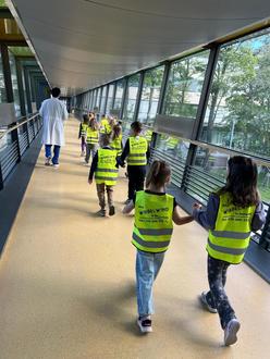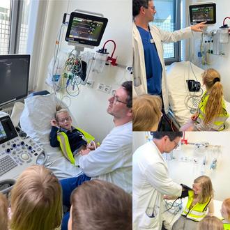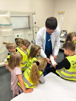 Unsere Führung begann in der Notaufnahme, denn dort befindet sich ein riesiges Bild des Klinikums. Somit bekamen wir einen ersten Eindruck, wie groß das Krankenhaus ist, was sich darin alles befindet und was wir uns anschauen werden. Wir löcherten Dr. Mittenzwey mit Fragen und glänzten ebenso mit bereits vorhandenem Wissen. Danach sahen wir uns sehr viele verschiedene Räume an. Und ausprobieren durften wir natürlich auch einiges. So sahen wir beispielsweise mit Hilfe eines Ultraschallgerätes, wie ein Herz pocht, es wurde der Blutdruck am Finger gemessen, ein EKG wurde auf die Brust eines Kindes geklebt und einige durften Sauerstoff durch Masken und Schläuche einatmen. In einem anderen großen Raum voller Geräte, einer Liege und sehr hellem Licht, wurde einem Kind ein Gipsverband angelegt - natürlich nur aus demonstrativen Zwecken. Spannend fanden wir, dass es gar nicht weh tut, wenn man einen Gips entfernen muss, denn die Säge kann nur den Gips durchtrennen, tut aber ganz und gar nicht auf der Haut weh! Zum Schluss durften wir sogar dorthin, wo sonst nie oder nur ganz selten Besucher hingehen dürfen: auf den Hubschrauberlandeplatz! Auf dem Dach des Klinikums hatten wir einen sagenhaften Blick über Erfurt! Leider, oder besser gesagt zum Glück, landete gerade kein Notfall-Hubschrauber auf dem Landeplatz. Zum Schluss bekamen wir sogar eine echte eigene Spritze (ohne Nadel) zum Basteln und Spielen.