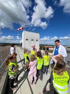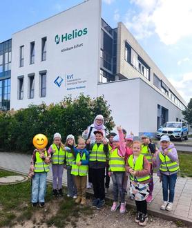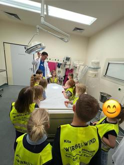 Am 15. Mai 2025 unternahmen die Vorschüler der Kindereinrichtung „Wirbelwind" in Döllstädt einen tollen Ausflug nach Erfurt. Ziel war das Helios Klinikum. Mit Bus und Bahn waren wir schon sehr zeitig unterwegs. Frühstücken durften wir dann in der Cafeteria des Krankenhauses. Nachdem wir uns gestärkt hatten, holte uns auch schon Oberarzt Dr. Mittenzwey ab.