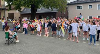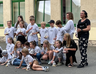 Die Schulleiterin Frau Funk-Schulz verlässt zum 1. August 2025 die Schule, um neue Aufgaben als Lehrerin und Schulleiterin an einer anderen Schule zu übernehmen. Sie wurde in einer bewegenden Geste von allen Kindern mit einem gemeinsamen Tanz und Gesang zum Titel „Neuanfang“ von Clueso überrascht - eine symbolträchtige und herzliche Verabschiedung, die für Gänsehautmomente sorgte.