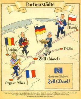 Bild aus dem Comic „Geschichten aus Zell an der Mosel“ - Mit der Verleihung des Europa-Diploms wird in besonderer Weise die bereits seit 65 Jahren bestehende Partnerschaft der Stadt Zell mit Crépy-en-Valois und Antoing und das europäische Engagement unserer Stadt auf europäischer Ebene anerkannt und geehrt.