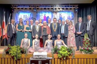 Gruppenbild nach dem Festakt v.l.n.r. Landrat Manfred Schnur, Weinprinzessin Maja Treis, Weinkönigin Lena Fischer, Sänger Robert Theisen, Stadtbürgermeister Hans-Peter Döpgen, Sopranistin Agnes Selma Weiland, Bürgermeisterin von Crépy-en-Valois Virginie Douat, 1. Beigeordneter Kalheinz Weis, Bürgermeister Plonsk Andrzej Pietrasik, Bürgermeister Verbandsgemeinde Zell Jürgen Hoffmann, Bürgermeister Triptis Peter Orosz, Historiker Dr. Christoph Krieger, MdL Anke Beilstein, MdEP Ralf Seekatz, MdB Dr. Marlon Bröhr, Ballettgruppe „Jump“.