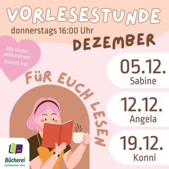 Im Dezember warten nun noch drei gemütliche Vorlesestunden an Donnerstagnachmittagen auf uns - nacheinander lesen an verschiedenen Terminen Angela, Sabine und Konni! Herzlichen Dank an dieser Stelle für Eure Zeit und Bereitschaft, eine echte Bereicherung!