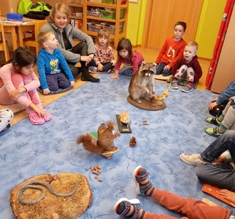 Am Donnerstag, den 2.2.2023 trafen wir uns nach dem Frühstück und freuten uns über den Besuch von Frau Weise, die uns stets bei den Waldtagen begleitet. Heute trafen wir uns, um über den Wald und seine Bewohner im Winter zu sprechen.
