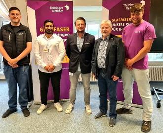 In der Mitte des Bildes sehen Sie Herrn Dennis Carl. Er ist der Fachgebietsleiter Endkundenvertrieb und Kundenservice der Thüringer Netkom. Die beiden Herren links und der Herr rechts sind Mitarbeiter einer Firma, die im Auftrag der Thüringer Netkom die Anschlüsse vermarktet, u. a. auch die Hausbesuche durchführen. Der fünfte Herr auf dem Foto ist der Bürgermeister Peter Orosz.
