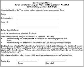 Die Verwaltungsgemeinschaft Triptis selbst veröffentlicht seit Januar 2020 aufgrund datenschutz- und melderechtlicher Regelungen nur noch runde Geburtstage ab dem 70. Lebensjahr und Ehejubiläen ab dem 60. Ehejubiläum (diamantene Hochzeit) im Amtsblatt, für die uns eine gesonderte Einwilligung vorliegt. Da wir gern weiterhin Ihre Jubiläen - soweit Sie dies wünschen - veröffentlichen, übersenden Sie die nachfolgende Einwilligungserklärung bitte an:
