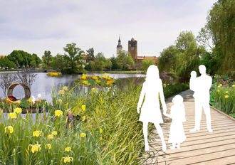 Im Schlosspark erwarten uns dann viele neue Wege, die immer an die Laufwege und bereits vorhandenen Trampelpfade erinnern. Daher haben wir diese Wege Lebensadern benannt, denn sie verbinden bereits jetzt Ein- und Ausgänge des Parks. Der schöne alte Baumbestand soll eine Pflege und Überholung erhalten, so dass sowohl Bestand als auch Sicherung gewährleistet werden können. Die durch Wege und Kreuzungen entstehenden Flächen werden einer bestimmten Funktion zugeschrieben. Dabei sind Picknickflächen, Spielbereiche für mehrere Altersklassen und Arten von Kleinkind bis Junior und von Wasser-, Matsch-, Kletter- bis Ballspielplätze. Natürlich werden auch im Landesgartenschaujahr die entsprechenden Blumenbänder und Rabatten nicht fehlen! Auch für ein gastronomisches Angebot wird auf dem Schaugelände gesorgt sein.