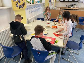 Die Kinder haben mit Feuereifer das Gemüse gewaschen und kleingeschnitten. Der Umgang mit Gemüseschälern und Messern klappte problemlos und weitgehend unfallfrei.