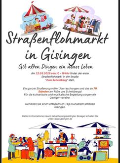 Von 10 bis 16 Uhr findet unser erster Gisinger Straßenflohmarkt statt. Neben zahlreichen gewiss tollen Ständen gibt´s reichhaltige Verpflegung und Unterhaltung. Freut Euch auf einen tollen Flohmarkt-Sonntag!