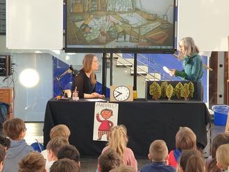 Ein Höhepunkt der Lesewoche ist immer der Besuch eines Autors oder einer Autorin. In diesem Jahr besuchte uns Dorota Wünsch, die schon mehrmals an unserer Schule zu Gast war. Dieses Mal kam sie aber nicht allein, sondern brachte die Schauspielerin Jessica Schultheis vom Theater Überzwerg mit. Sie präsentierten zusammen die szenische Bilderbuchlesung „Wo ist Theatrine?“. Mit Charme, viel Energie und vor Ort live gemalten Skizzen entführten die beiden die Kinder in die Welt von Schauspiel, Oper und Ballett. Unsere Schüler und Schülerinnen, aber auch das Lehrerkollegium, waren restlos begeistert und bedachten die Aufführungen mit großem Applaus.