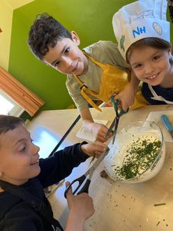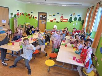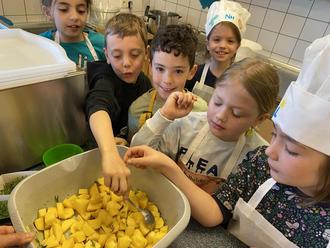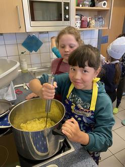 Nachdem die Kinder sich in den bisherigen Unterrichtsstunden bei der Zubereitung von Knabbergemüse, Brotgesichtern, Nudelsalat oder Schlemmerquark sehr gelehrig und geschickt angestellt hatten, ging es in der letzten Woche an gekochte bzw. gebratene Speisen. Neben der Vorbereitung der Lebensmittel sollten die Kinder auch den Umgang mit Herd und Backofen lernen.