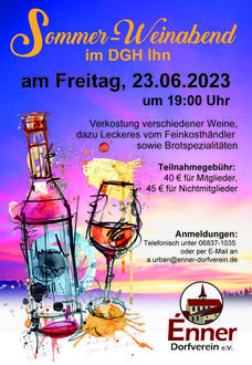 Sommelier Lars Leistenschneider (Weinscheune Hüttersdorf) präsentiert an diesem Abend 9 leckere Weine und einen Schaumwein. Dazu werden feinste Käse-, Salami- und Schinkensorten, Pesto und Olivenöl vom Feinkosthändler, sowie Brot der „slow baking" Bäckerei Pains & Tradition aus Luxemburg serviert. Für unsere Mitglieder beträgt die Teilnahmegebühr 40,00€, Nichtmitglieder zahlen 45,00€. Die Anmeldung ist ab sofort möglich: telefonisch (06837-1035) oder per E-Mail: a.urban@enner-dorfverein.de