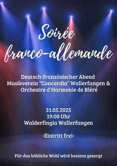 Als Highlight des Wochenendes laden wir alle Wallerfanger/innen am 31.05.2025 um 19:00 Uhr zu einem Deutsch-französischen Abend in die Festhalle Walderfingia ein. Gäste von außerhalb sind natürlich ebenso herzlich willkommen. Der Abend wird eingeleitet durch ein Gemeinschaftskonzert der beiden Orchester. Danach freut sich der Musikverein darauf, mit allen französischen und deutschen Gästen bei hoffentlich bestem Frühsommer-Wetter einen stimmungsvollen Abend zu verbringen. Für das leibliche Wohl wird bestens gesorgt werden.