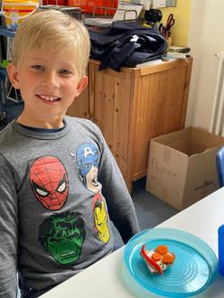 Die Kinder haben mit Feuereifer das Gemüse gewaschen und kleingeschnitten. Der Umgang mit Gemüseschälern und Messern klappte problemlos und weitgehend unfallfrei.