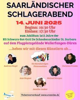 Die Karnevalsgesellschaft Schwarz-Rot-Gold De Schnokenschießer aus St. Barbara lädt am 14. Juni 2025 ab 19:30 Uhr zu ihrem Jubiläum 1x11 Jahre zu einer besonderen Open-Air-Veranstaltung ein, nämlich dem "Saarländischen Schlagerabend", der auf dem Flugplatzgelände in Düren stattfindet. Das dürft ihr nicht verpassen! Wer ist mit am Start? Sänger, die aus dem Saarland stammen oder im Saarland wohnen. Natürlich wird auch eine Künstlerin aus dem benachbarten Rheinland-Pfalz auf der Bühne stehen. Andreas Nagel, Christian Franke, Michael Morgan, Jens Wagner, André Mathieu, Jennifer Junker, Die Barmherzigen Plateausohlen und Leslie Dähler aus der Pfalz werden wir begrüßen dürfen.