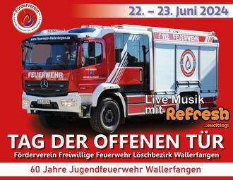 In diesem Jahr wird das 60-jährige Bestehen der Jugendfeuerwehr Wallerfangen gefeiert. Dazu findet ab 08.30 Uhr ein Leistungsmarsch der Nachwuchskräfte statt. Ab 18.00 Uhr wird der Tag der offenen Tür rund um das Gerätehaus in der Sportplatzstraße offiziell mit dem Fassanstich eröffnet. Danach gibt es ab 20.00 Uhr Live Musik mit „Refresh“.