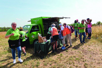 Dort wartete ein Team von „Bewahren und Erneuern“ mit fleißigen und charmanten Damen am „Bringwähnchen“ auf die Wanderfreunde und verwöhnte ihre Gäste kulinarisch und mit erfrischenden Getränken. Sehr viel lobende Worte wurden auf letzebuergisch angesichts der nicht alltäglichen Bewirtung in luftiger Höhe bei prächtiger Aussicht ausgesprochen.