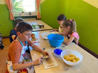 Alle Kinder waren eifrig bei der Sache: Kartoffeln schälen und kleinschneiden, Salat putzen und waschen, Kartoffeln stampfen und mit Milch verrühren, Salatsauce anrühren, Kräuter kleinschneiden; alle Arbeiten machten den Kindern viel Spaß.