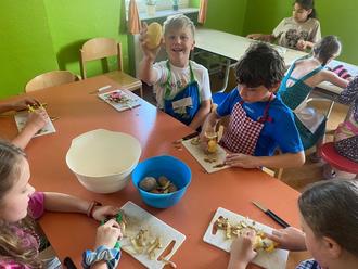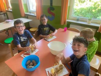 Nachdem die Kinder sich in den bisherigen Unterrichtsstunden bei der Zubereitung von Knabbergemüse, Brotgesichtern, Nudelsalat oder Schlemmerquark sehr gelehrig und geschickt angestellt hatten, ging es in der letzten Woche an gekochte bzw. gebratene Speisen. Neben der Vorbereitung der Lebensmittel sollten die Kinder auch den Umgang mit Herd und Backofen lernen.