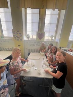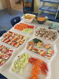 Innerhalb von weniger als 2 Stunden haben die Kinder mit Unterstützung durch einige Mütter und zwei Väter verschiedene Gerichte zubereitet: Brotgesichter, einen vegetarischen Brotaufstrich, Knabbergemüse mit Schnittlauchquark, Nudelsalat, Backofenkartoffeln, Früchtequark und Bananenmilch.