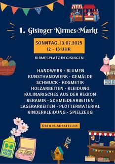 Im Rahmen der viertägigen Gisinger Kirmes lockt am Sonntag, den 13. Juli, der erste Gisinger Kirmesmarkt die Besucher von 12 bis 16:00 Uhr auf den Festplatz.