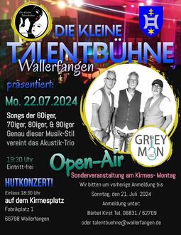 Beginn ist um 19:30 Uhr, Anmeldungen bitte bis 21.07. bei Bärbel Kirst, 06831/62709 oder unter talentbuehne@wallerfangen.de
