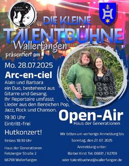 Start wie immer um 19:30 Uhr, wir bitten um Anmeldung bis 27.08. unter talentbuehne@wallerfangen.de oder Bärbel Kirst 06831 62709.