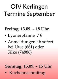 Der Bistro Abend findet am Freitag, den 13.09. ab 18 Uhr statt, natürlich im DGH. Wir kochen für euch eine Lyonerpfanne zum Preis von 7 € – frisch aus der großen Pfanne. Wir hoffen auf gutes Wetter, damit wir die Veranstaltung draußen durchführen können. Anmeldungen dazu sind ab sofort bei Uwe (661) oder Silke (74886) bis zum Mittwoch, den 11.09. möglich.