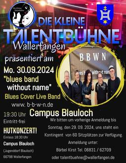 Am Montag, 30.09.2024 präsentieren wir die Blues Band Without Name, eine Blues-Cover-Band aus Hilbringen.