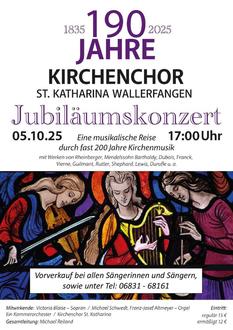 Aus diesem Anlass möchte der Chor mit einem Konzert am 05.10.2025 um 17:00 Uhr in unserer Pfarrkirche St. Katharina einen Glanzpunkt in seinem Jubiläumsjahr setzen. Bei diesem Konzert begibt sich der Chor mit seinen Zuhörern auf eine musikalische Reise durch fast 200 Jahre Kirchenmusik, mit Werken von Rheinberger, Mendelssohn Bartholdy, Dubois, Franck, Vierne, Guilmant, Rutter, Shephard, Lewis und Duruflé. Verstärkt wird der Chor dabei durch einige Gastsängerinnen und Gastsänger, Viktoria Blaise mit einem Sopran-Solo, einem Kammerorchester, sowie Michael Schwedt und Franz-Josef Altmeyer an der Orgel.