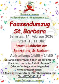 Am 14.02.2026 findet in St. Barbara unser Straßenumzug mit anschließender Party statt.