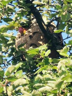Wie bereits in mehreren Medien berichtet, breitet sich die asiatische Hornisse in unserer Gegend sehr stark aus. Neuerdings wurden bei abzuerntenden Apfelbäumen zwei große Nester gefunden und unschädlich gemacht.