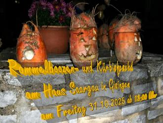 Am Freitag, 31.10.2025 findet ab 18:00 Uhr am Haus Saargau Gisingen das traditionelle Rommelboozen und Kürbisfesch statt. Der Förderverein Bewahren und Erneuern bietet kleine Snacks und Getränke an, für Kinder stehen Rommeln oder Kürbisse zum Schnitzen bereit – bei schönem Wetter sind zudem auch ein kleines Feuer für Kartoffeln und Stockbrote geplant.