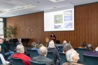 Im Anschluss an die einleitenden Worte weihte Dr. Körlin die rund 80 anwesenden Gästen auf anschauliche Weise in die Geheimnisse des alten Bergwerkes ein. In ihrem Vortrag stellte sie unter anderem dar, in welcher Form die römischen Bergleute den Azurit abgebaut haben, wie die damalige Arbeitssicherheit unter Tage aussah und auf welche Weise die Bergleute den typischen Problemen des Bergbaus begegneten.