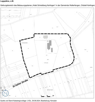 Der Bebauungsplan wird im Bereich des bestehenden Hotels „Scheidberg“ mit Umfeld aufgestellt, d. h. für das Gelände nördlich der St. Vallier Straße. Das Plangebiet befindet sich ca. 400 m östlich des Siedlungskörpers von Kerlingen und ca. 800 m südwestlich des Siedlungskörpers von St. Barbara. Das Plangebiet ist umgeben von Wald.
