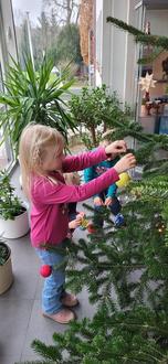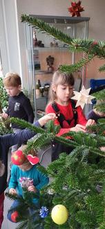 Die Kinder und Erzieherinnen der älteren Gruppen bastelten, malten und klebten fleißig, so dass die Vorschulkinder schließlich den schönen Weihnachtsschmuck vor Ort an den Baum hängen konnten.