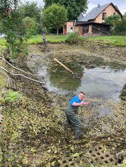 Die Gemeinde saniert momentan im Rahmen eines Förderprogramms den stark in die Jahre gekommenen ehemaligen Feuerlöschteich, um aus ihm wieder ein ansehnliches Plätzchen in unserem Dorf zu machen. Damit die Sanierung überhaupt starten konnte, waren intensive Vorarbeiten nötig. So musste im Vorfeld der Teich ausgepumpt und die dort lebenden Tiere (Frösche, Kröten, Fische) sowie die Seerose umgesiedelt werden, um sicherzustellen, dass weder Tiere noch Pflanzen Schaden durch die anstehenden Bauarbeiten nehmen.