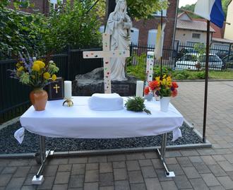 Eine Besonderheit war die Gestaltung eines eigenen Kinderaltars, der extra für die Prozession vorbereitet wurde. Die Kinder trugen ihr neues Kreuz, eine Kerze, die Bibel und Blumen zum Altar. Auch die Lesung und die Fürbitten wurden wieder von den Kindern selbst vorgetragen.