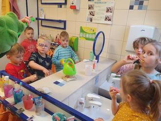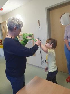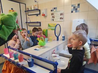 Zähneputzem macht allen Kindern Spaß. Frau Ringleb vom Jugendzahnärztlichen Dienst besuchte unsere Kinder zur Zahnvorsorge. Mit dem Krokodil und der großen Bürste erklärt sie den Kindern die Zahnputztechnik. Gesunde Ernährung und das fleißige Zähneputzen sind wichtig für gesunde Zähne.