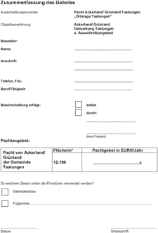 Die Verpachtung erfolgt gegen Gebot. Mit dem Gebot ist der Nutzungszweck (z. B. Getreideanbau) einzureichen. Das Gebot bedarf der Schriftform. Bitte nutzen Sie dafür die Formulare „Zusammenfassung des Gebotes" und „Zusammenfassung des Gebotes-Streuobstwiese".