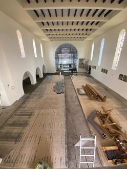 Momentan arbeitet die Malerfirma Kruse noch im Bereich des Marienaltars und im Treppenhaus. Firma Klauke hat bereits mit dem Verlegen der Fußbodenplatten begonnen. Danach werden die Holzpodeste abgeschliffen und neu eingeölt.
