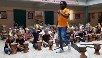In der Zeit vom 19.-23. Juni 2023 fand an der Grundschule in Berlingerode eine Projektwoche zum Thema „Afrika“ statt. In den Unterrichtsstunden wurden passende Inhalte besprochen, beispielsweise über die dortigen Tiere, Speisen, Musik und Religion. Eine Besonderheit war das tägliche Trommel-Training für die Schüler. Fallou Sy vom Trommel-Theater aus Gießen lehrte den Kindern täglich den Umgang mit der Trommel und zeigte ihnen verschiedene Rhythmen. So wurde aus Konzentrationstraining, einzelnen Liedern und einer kleinen Geschichte ein fertiges Bühnenstück, welches zum Abschluss der Projektwoche am Freitag, den 23. Juni vor Eltern und Gästen aufgeführt wurde. Der beeindruckende Klang der Trommeln und die Fähigkeiten, die die Kinder in der kurzen Zeit erlernt hatten, ließen die Zuschauer staunen. Fallou schaffte es, nicht nur die Kinder zum Tanzen, Trommeln und Singen zu motivieren. Am Ende der Aufführung bebte die Schule und alle machten mit: Eltern, Geschwister und Mitarbeiter der Schule. Es herrschte eine beeindruckende, ausgelassene Stimmung.
