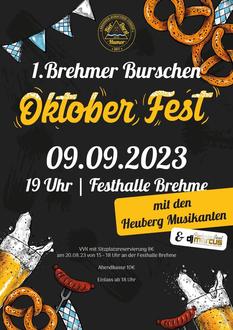 Wir, der Brehmer-Burschen-Verein e.V., richten in diesem Jahr zum 1. Mal ein Oktoberfest aus. Wir starten am 09.09.2023 um 18:00 Uhr mit dem Einlass in die Brehmer Mehrzweckhalle. Pünktlich um 19:00 Uhr, wenn das erste Holzfass angeschlagen wurde und die „Heuberger Musikanten“ ihre Trompeten erheben, beginnen wir unser Fest mit einem kräftigen: „O´zapft is“.