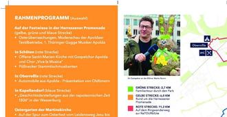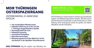 Für den Osterspaziergang sind vier Routen geplant, die Wanderfreunde aller Altersgruppen in und um Apolda führen werden. Die Wanderer können zwischen 9 und 12 Uhr auf die Strecken gehen - offizieller Start ist um 9 Uhr. Auf dem Markt gibt es bis 16 Uhr ein großes Bühnenprogramm mit vielen Osterüberraschungen. Die MDR Thüringen Radiomoderatoren Marko Ramm und Timo Hartmann begleiten auf dem Marktplatz in Apolda durch den Tag. Danach wird ab 16 Uhr in der Apoldaer Vereinsbrauerei mit der Band "Die Leut vom Wald" weitergefeiert.