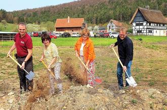 Den Startschuss für den Neubau des Eingangsgebäudes am Eichenberg des Thüringer Freilichtmuseums Hohenfelden gaben am 7. April 2024 mit einem Spatenstich, Landrätin Christiane Schmidt-Rose, Museumsleiterin Franziska Zschäck (2. v. l.), der Vorsitzende des Fördervereins Thüringer Freilichtmuseum Hohenfelden e. V., Achim Ramm (links im Bild) und Nils Havelmann als Architekt des Projektes. Eine schöne Kulisse für das erfreuliche Ereignis bot der Handwerkertag, der an diesem Tag bei schönstem Frühlingswetter auf dem Museumsgelände stattfand.