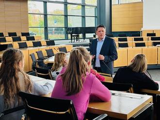 Der Saalfelder Landtagsabgeordnete Maik Kowalleck begrüßte persönlich die jungen Gäste, die im Plenarsaal auf den Stühlen der Abgeordneten Platz nehmen durften. Er berichtete über seine Arbeit als Landtagsabgeordneter.